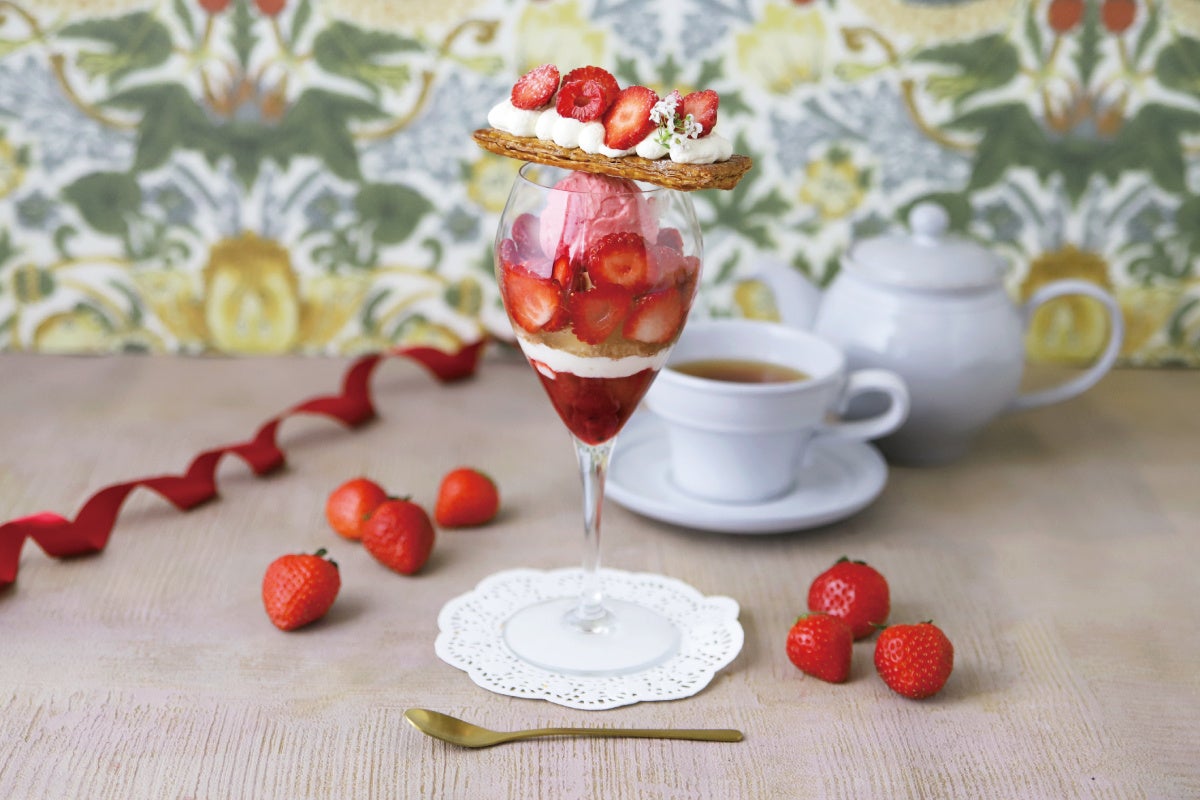 甘酸っぱい苺のコンフィチュールとマスカルポーネに練乳を合わせたクリームの苺パルフェ。シナモンクランブルのザクザク食感とライムジュレで香り豊かにトッピングの苺のミルフィーユと共にお召し上がりください。