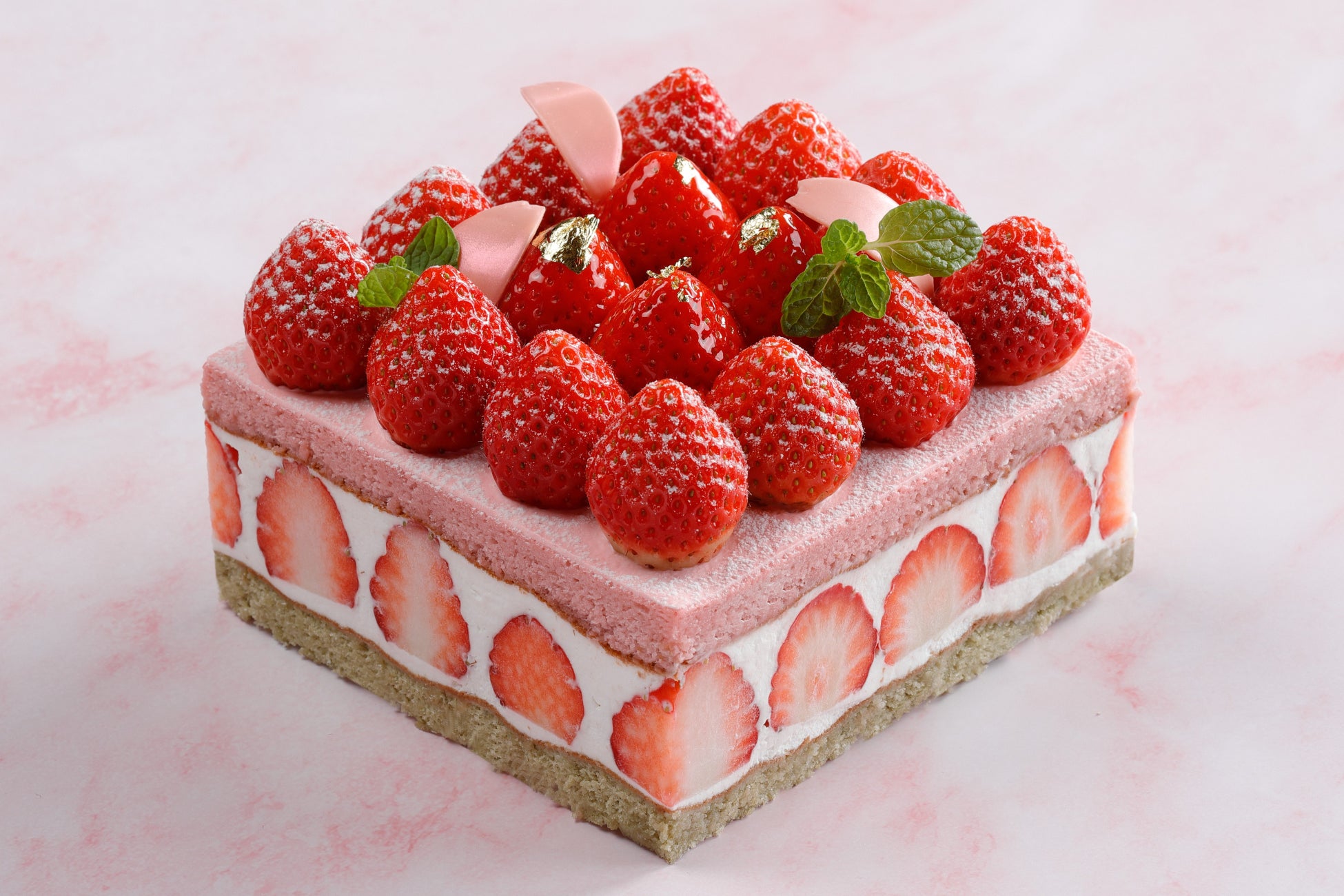 カフェ&グルメショップ カフェベルでは、いちご約30粒を贅沢に使用した菱餅風のケーキをご用意します。甘くてジューシーないちごを存分にご堪能いただけます。