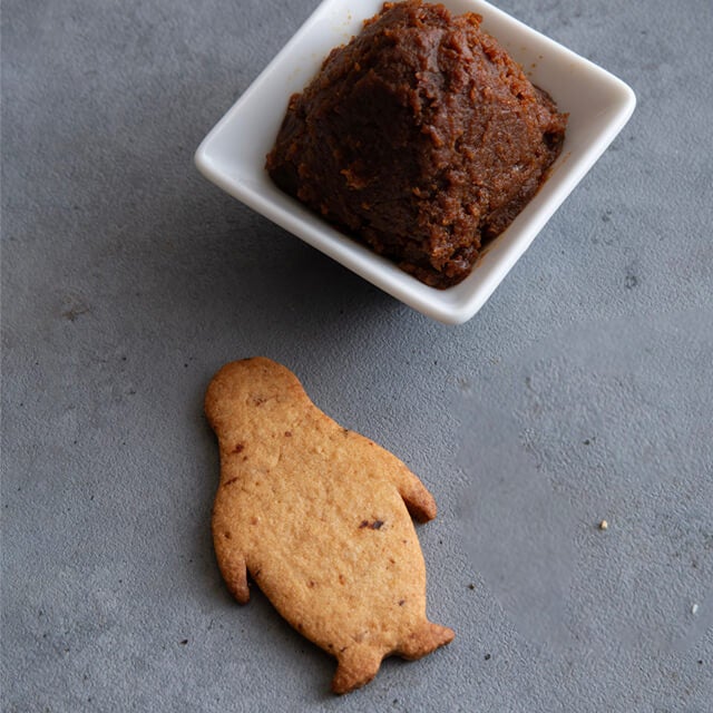 何種類もの味噌で試作を重ね、秋田県の古式味噌造りの技法で作った「柏寿(はくじゅ)味噌」を選定しました。かつおだしと素焚糖の風味も香る、甘じょっぱいクッキーです。緑茶や玄米茶、日本酒とも好相性です。