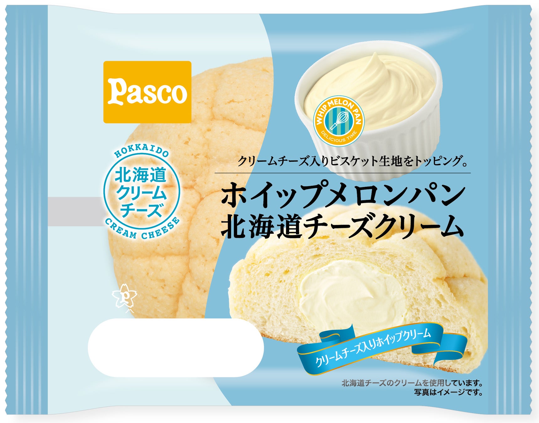北海道産クリームチーズを練り込んだチーズ風味のビスケット生地をトッピングしたメロンパンに、北海道産クリームチーズ入りのホイップクリームをたっぷり入れました。