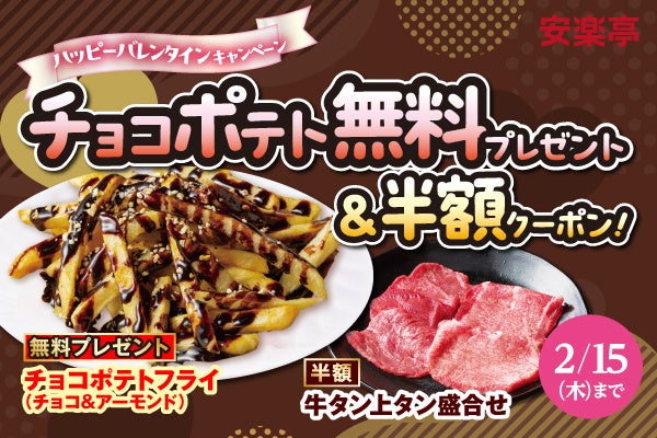 焼肉レストラン安楽亭(本社:埼玉県さいたま市、代表取締役:柳 先)は、2024年2月9日(金)から2月15日(木)まで、「チョコポテトフライ」のプレゼントや「牛タン上タン盛合せ」が半額の540円(税込594円)で楽しめる「ハッピーバレンタイン・キャンペーン」を開催します。