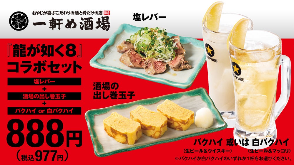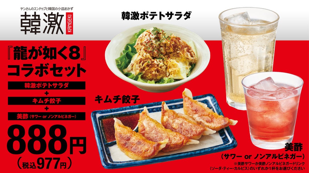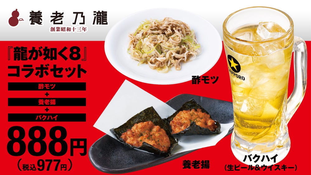 今回のキャンペーンでは、『龍が如く8』の発売を記念して、2024年2月9日(金)から2月20日(火)までの期間限定で、養老乃瀧グループ(養老乃瀧、だんまや水産、一軒め酒場、韓激)の対象の店舗にて、各グループ店舗オリジナルの『龍が如く8』コラボセットを販売します。