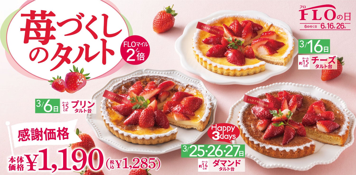 旬を迎えたフレッシュな苺をふんだんに使用した直径約14~15cmのホールタルトを、FLOの日限定価格・税込1,285円で販売いたします。
