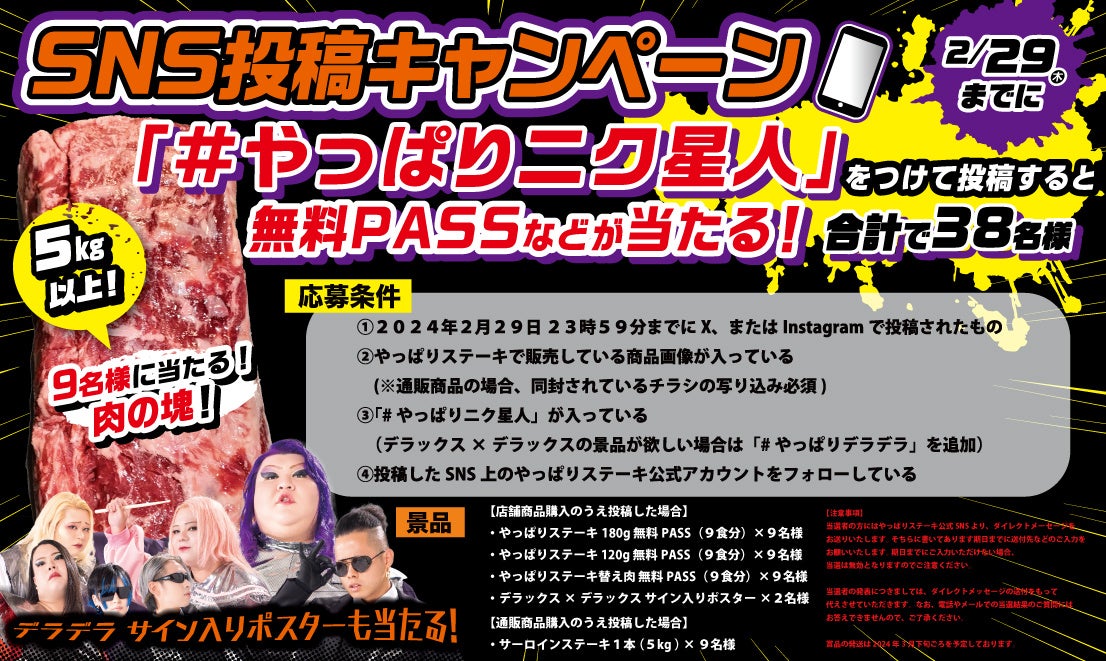 2月29日までに 「#やっぱりニク星人」 と一緒にやっぱりステーキの画像と食べた感想をX(Twitter)、またはInstagram に投稿してくれた方の中から抽選で「サーロインステーキ約5kg」「無料お食事PASS」が当たる!