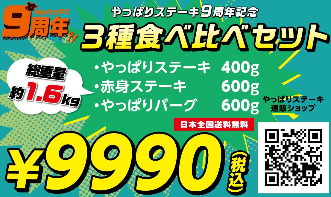 「やっぱりステーキが近くにない!」というお客様にもお得に楽しんでいただくためやっぱりステーキ公式通販サイトにて、期間限定で総重量1.6kgと超ボリューミーな「3種食べ比べセット」を9990円(税込)で販売します。しかも全国送料無料!