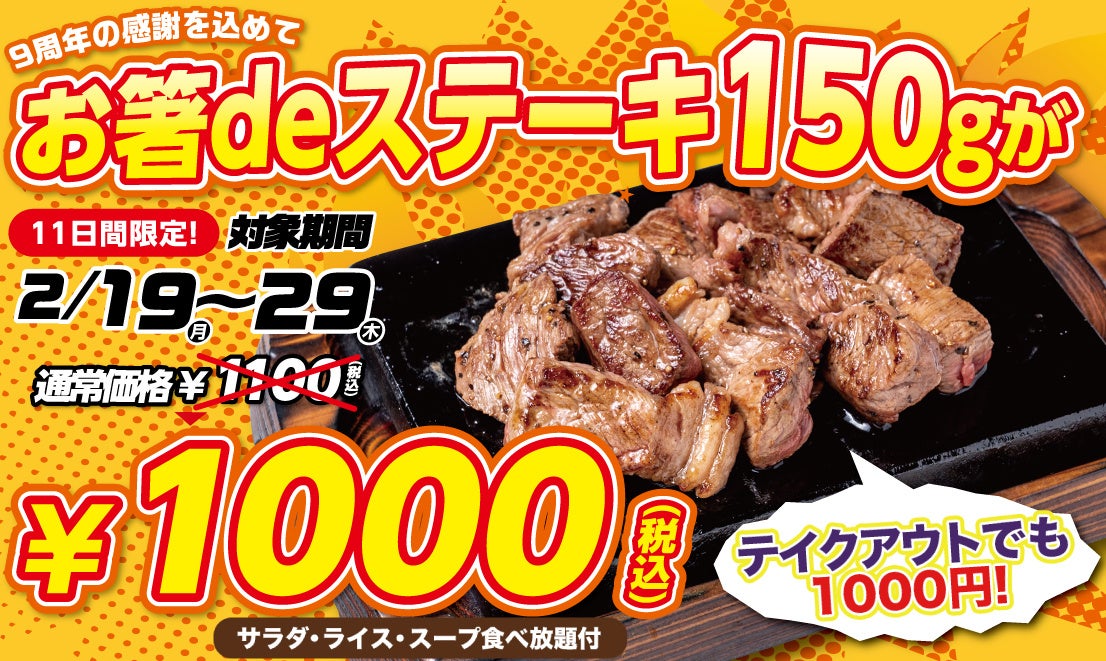 いつもご利⽤いただいている皆様にやっぱりステーキ9周年の感謝を込めて、2⽉19⽇から2⽉29⽇までの11⽇間限定で「お箸deステーキ® 150gを1000円(税込)で販売いたします。