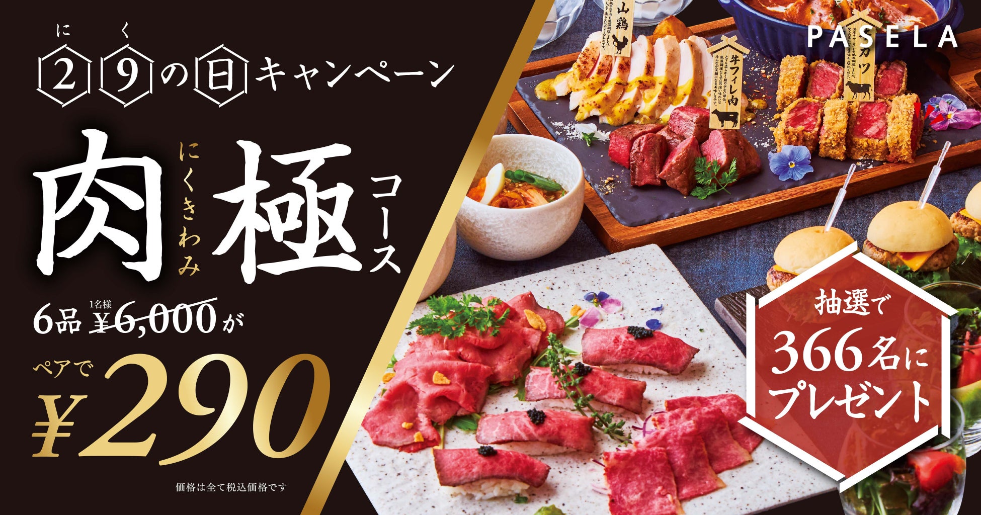 4年に一度のうるう年に、カラオケパセラが贈る『肉の日』キャンペーン!公式アカウントをフォロー&指定投稿をリポストすると抽選で366名に「“肉”極みコース」を290円で楽しめるペアチケットをプレゼント!