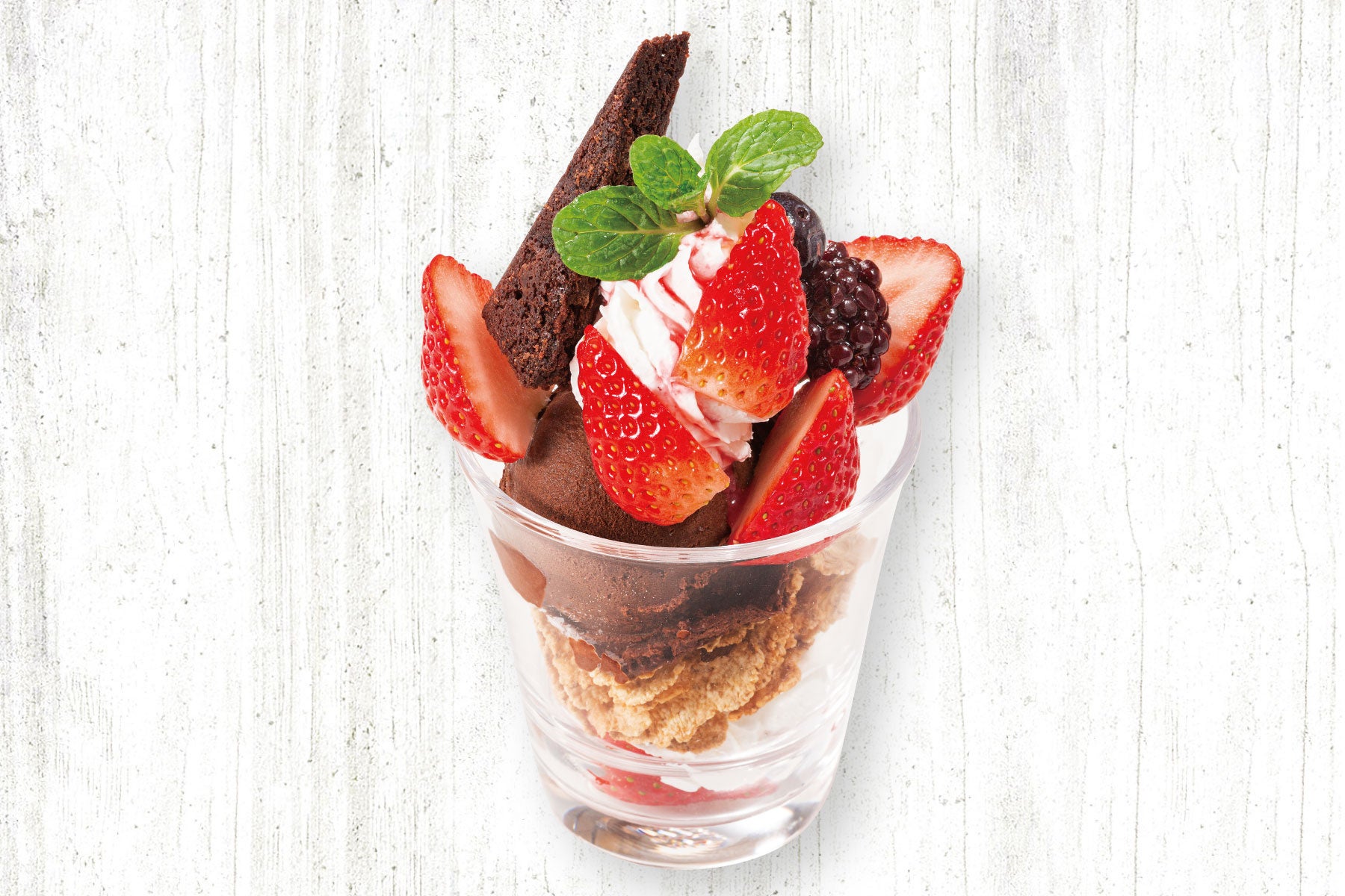 いちごとチョコレートという王道の組み合わせをカップサイズで楽しめるほどよいボリューム感のパフェです。いちごの甘酸っぱさ、チョコブラウニーとチョコアイスの濃厚さはもちろん、ミルクジェラートのほどよい甘さもいいアクセントになっていて、一つのグラスで濃厚さと爽やかさを一緒に感じることができます。