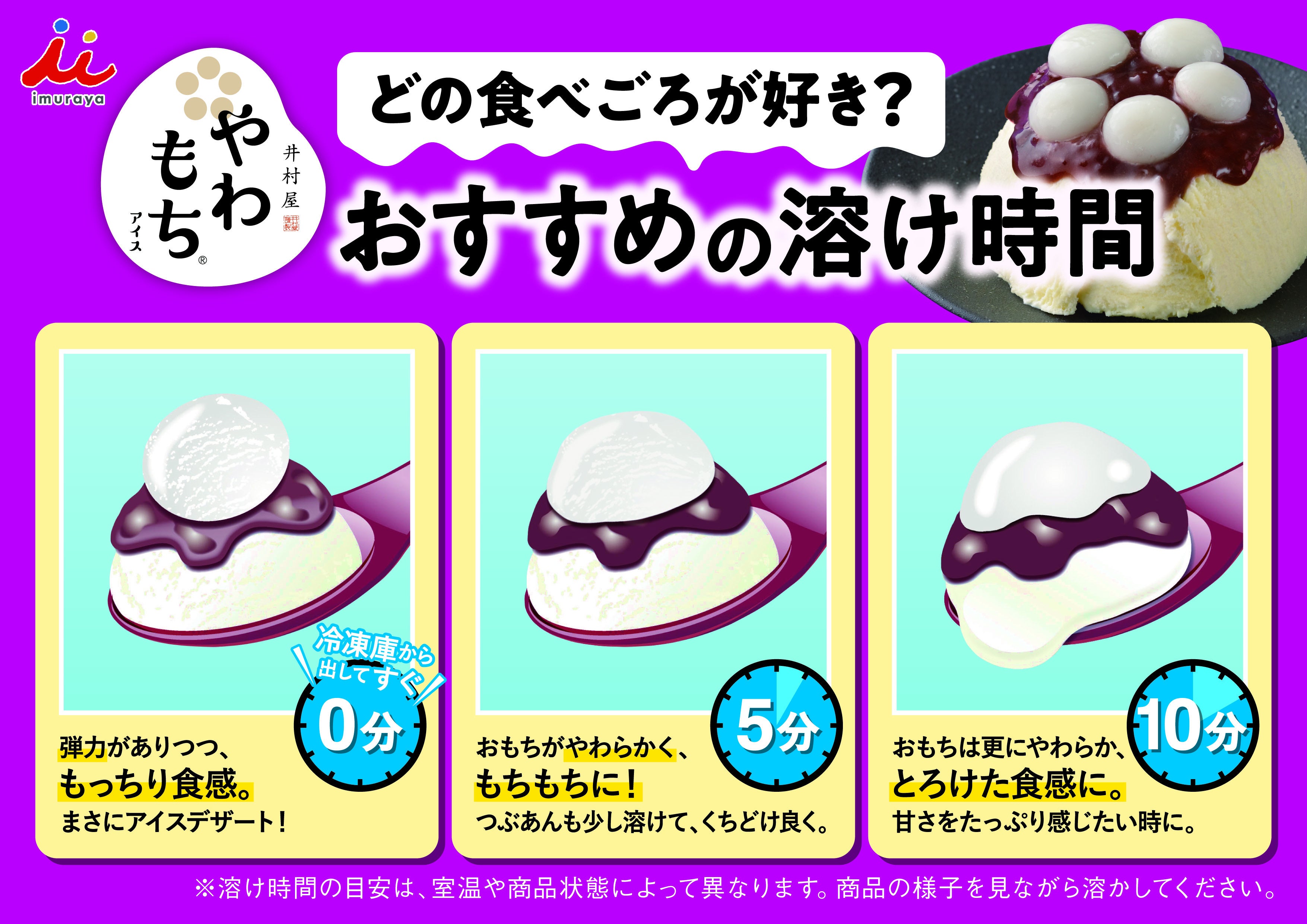 冷凍庫から出してすぐに食べてもおいしいやわもちアイスシリーズですが、溶け時間によって異なった味わいをお楽しみいただけます。