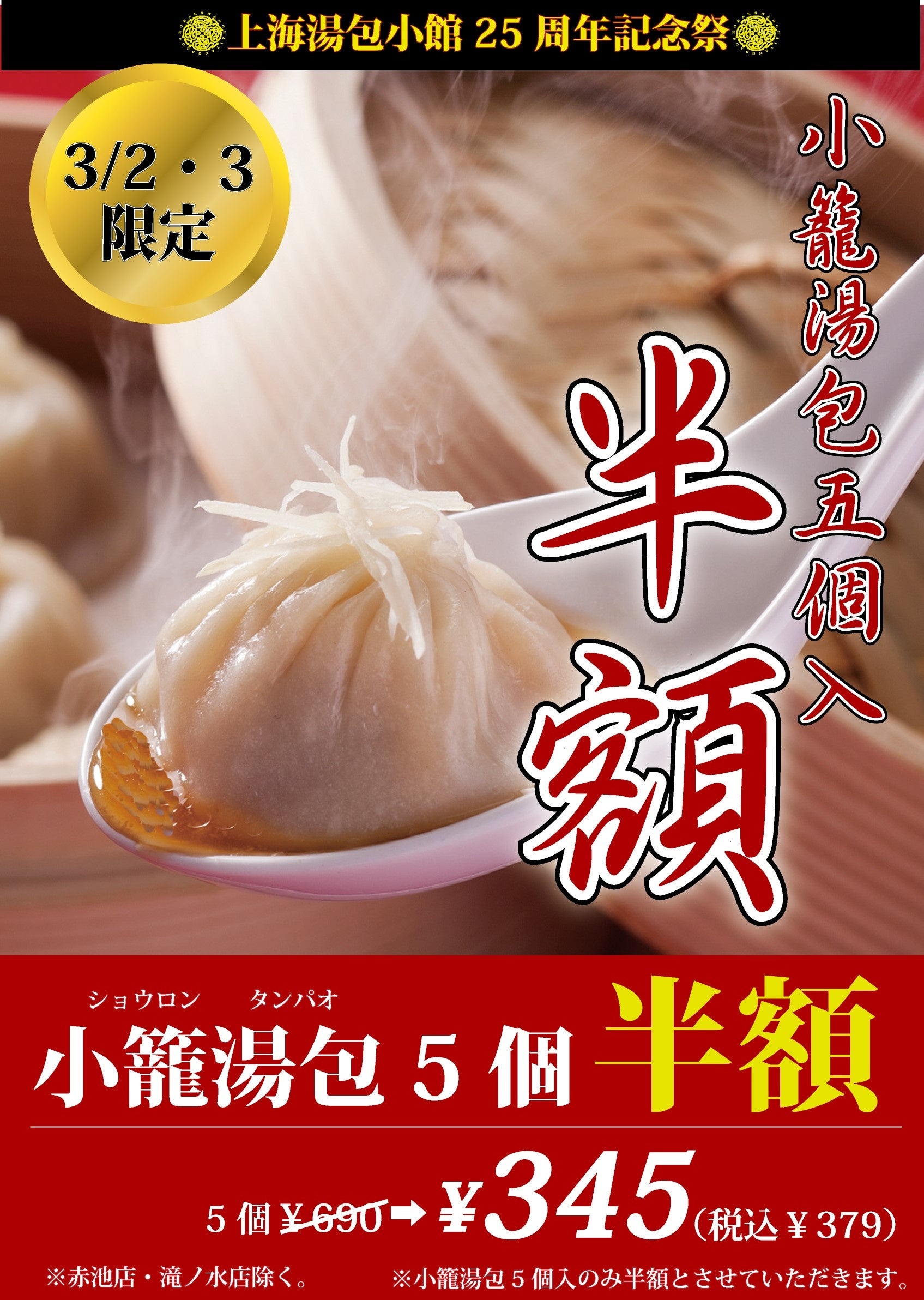 日頃のお客様のご愛顧に感謝いたしまして、2024年3月2日(土)、3月3日(日)の2日間、「25周年記念祭」として、小籠湯包5個を半額で提供させていただきます。
