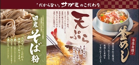 国産そばの実を毎日店内で挽いた粉を使用し、「三たて」にこだわったそばと、自慢の大海老天ぷらを組み合わせた、サガミのこだわりを存分に味わえる逸品です。