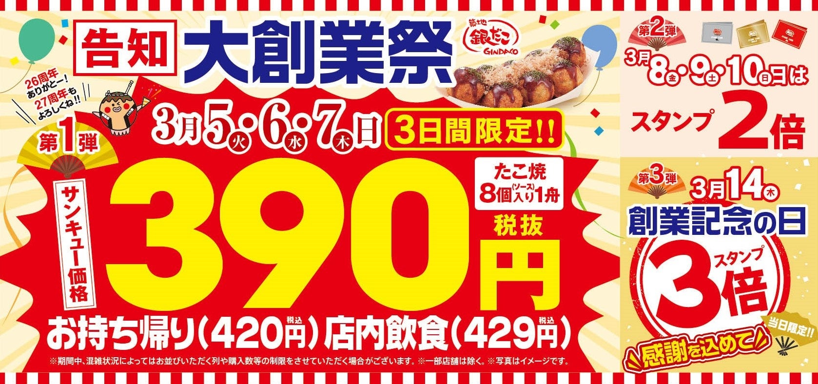 今年の築地銀だこ 『大創業祭』 第1弾は、3月5日(火)、6日(水)、7日(木)の3日間、心からの感謝を込めた ”サンキューセール“ を実施いたします!