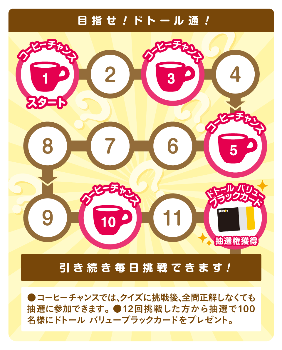 ドトールグループに関するクイズに解答し、10問全問正解すると抽選で期間合計30,000名様に、コーヒー1杯引き換え券(最小サイズ)をプレゼントします。クイズは1日1回チャレンジ可能。