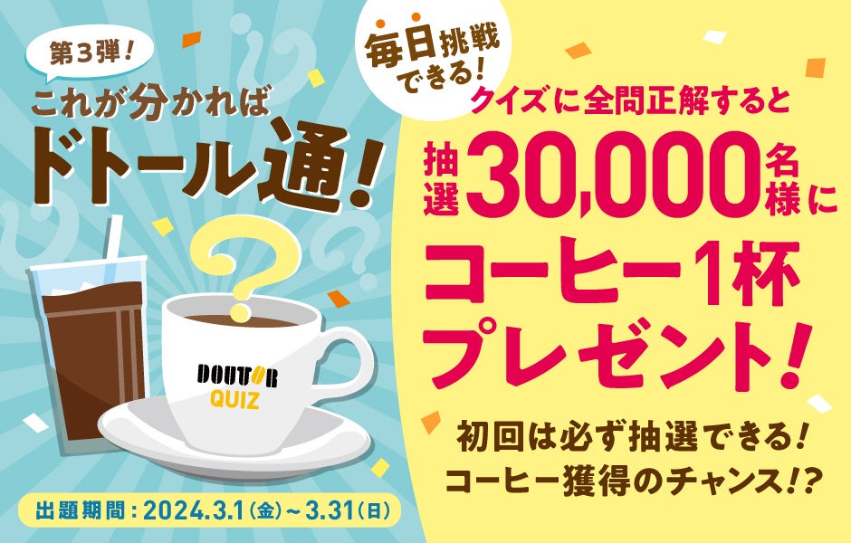 株式会社ドトールコーヒー(本社:東京都渋谷区/代表取締役社長:星野 正則)は、2024年3月1日(金)~3月31日(日)の期間中、ドトールグループにまつわるクイズに挑戦し10問全問正解すると、抽選で30,000名様にコーヒー1杯引き換え券をプレゼントする「クイズ!これが分かればドトール通!第3弾」を開催します。また、ダブルチャンスとして、期間中12回以上クイズに挑戦した方から抽選で100名様に、ドトール バリューブラックカードをプレゼントいたします。