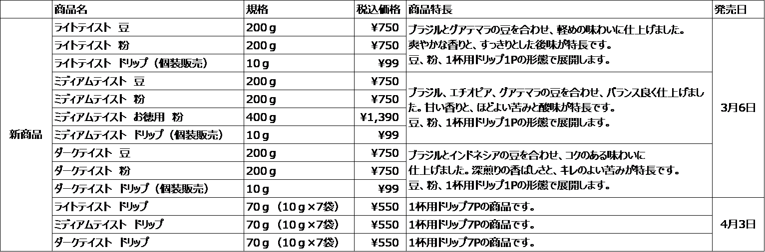 「ライトテイスト」はブラジルの豆に、爽やかな香りが特徴的なグアテマラの豆をブレンドし、軽めの味わいに仕上げています。「ミディアムテイスト」はブラジル、グアテマラの豆に、フルーティーな甘めの香りが特徴的なエチオピアの豆をブレンドし、ほどよい苦みと酸味のバランスが取れた味わいになっています。「ダークテイスト」はブラジルの豆に、深みのあるコクが特徴的なインドネシアの豆を合わせ、深煎りの香ばしさを感じる味わいです。