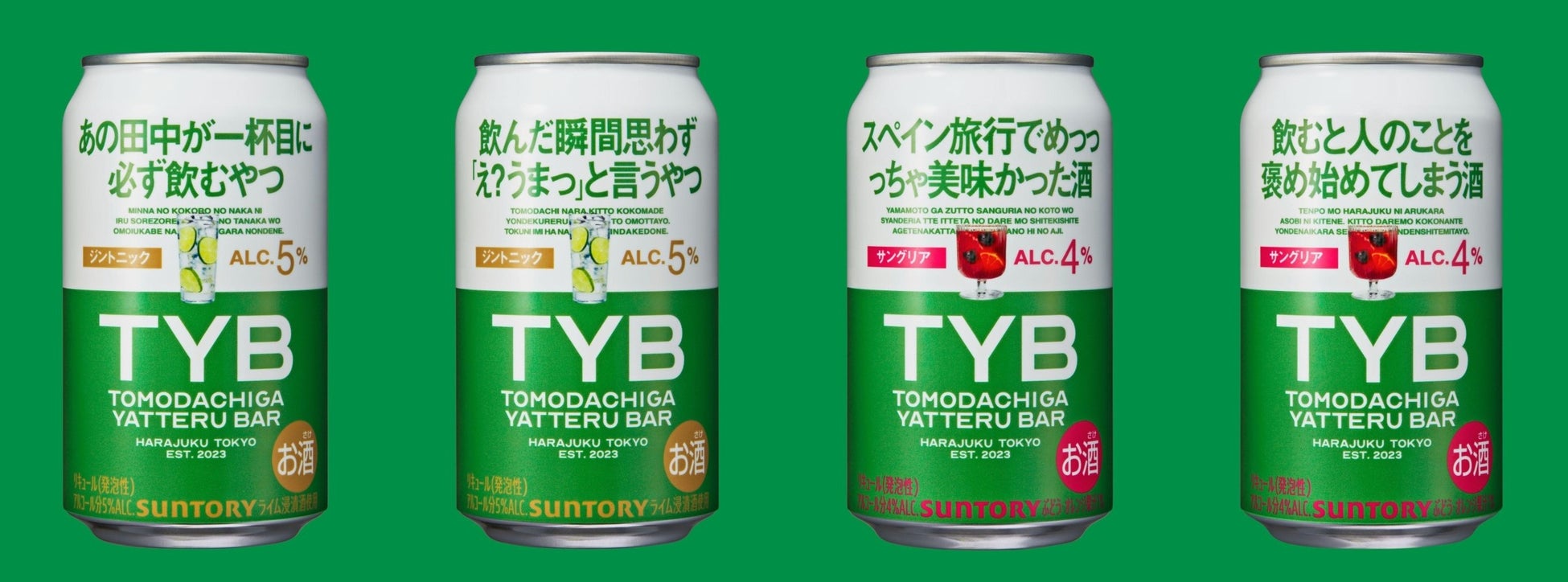商品のデザインは各2種類。店舗での友達接客を商品を通じても体験できるよう、ジントニックは『あの田中が一杯目に必ず飲むやつ』『飲んだ瞬間思わず「え?うまっ」と言うやつ』の2種類を、サングリアは『スペイン旅行でめっっっちゃ美味かった酒』『飲むと人のことを褒め始めてしまう酒』の2種類を展開しております。