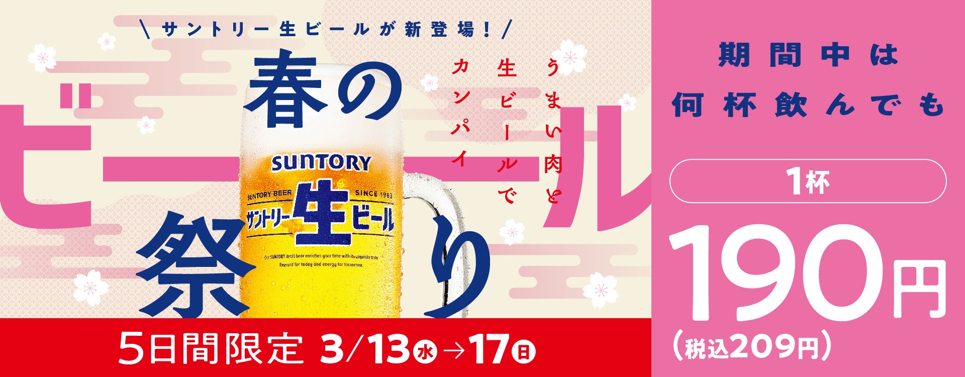 『焼肉の和民』春のカンパイ!新登場の「サントリー生ビール」が何杯飲んでも1杯190円(税込209円)で楽しめる「春のビール祭り」開催!