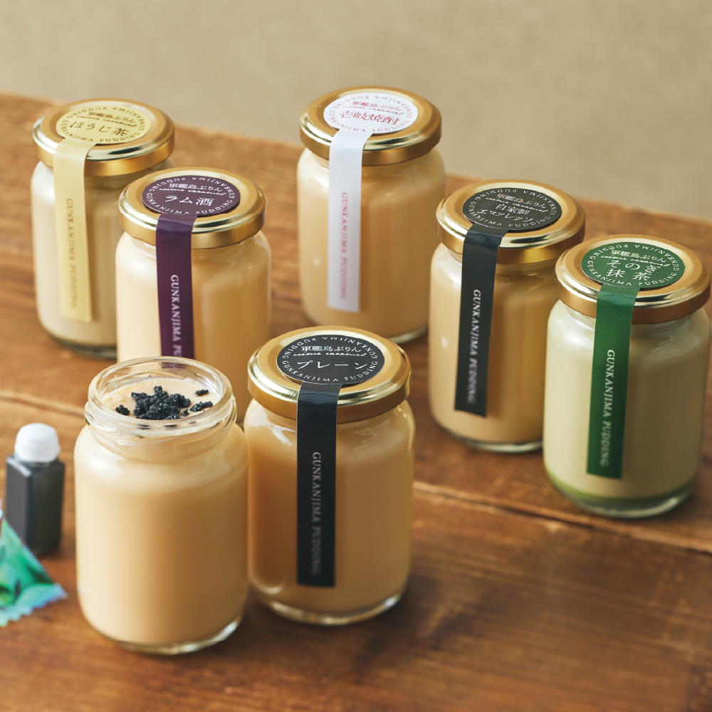 世界文化遺産に登録された通称・軍艦島(端島)をイメージしたなプリン。6種の風味がある中でも最も大人の味わいで魅了するのがダークラムを使ったこちらのラム酒味。雲仙牛乳や太陽卵などご当地食材を駆使。