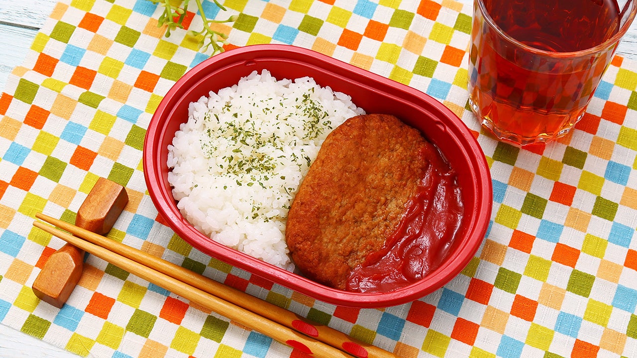 今回発売となる「だけ弁当(マルシンハンバーグ)」は、白いご飯に「マルシンハンバーグ」丸ごと1個を添え、その上にケチャップをかけたシンプルなお弁当です。サラダや野菜のお浸し、味噌汁などを組み合わせれば、栄養バランスの取れた「一食」がワンコインで完成します。