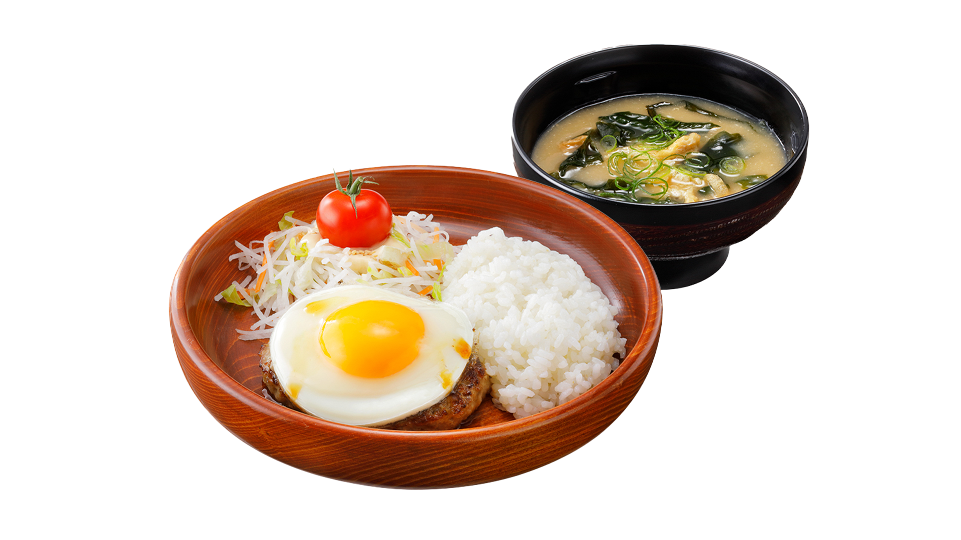 ハンバーグソースで食べるびっくりドンキーでしか味わえない卵かけご飯。うれしいみそ汁付きです。