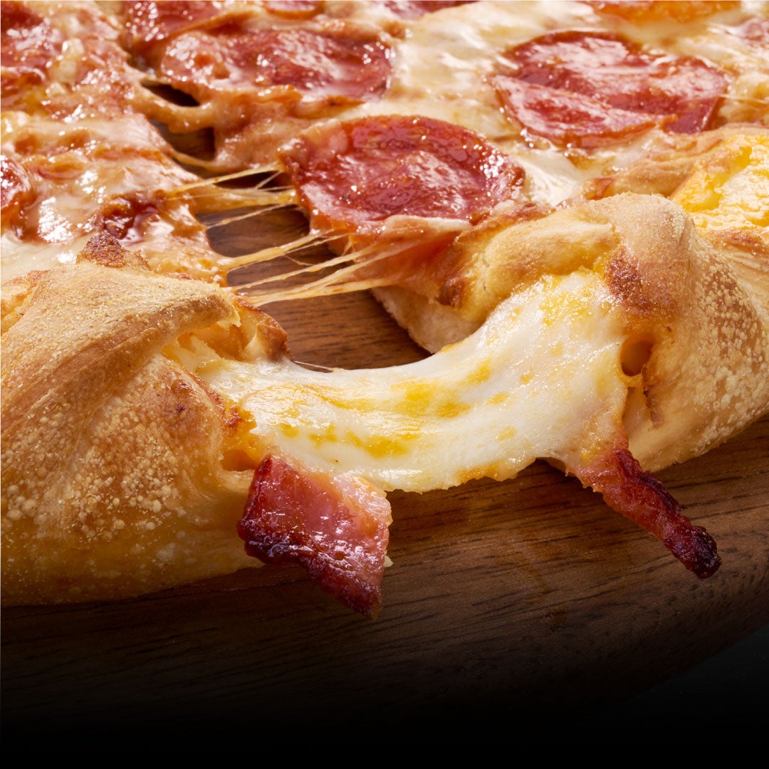 チーズンロールツイストに、さらに燻しベーコンとチェダーチーズソースをトッピングしました。100%モッツァレラチーズと濃厚なチェダーチーズソースに、ベーコンのスモーキーな風味が堪らない、相性抜群の味わいが楽しめるクラストです。