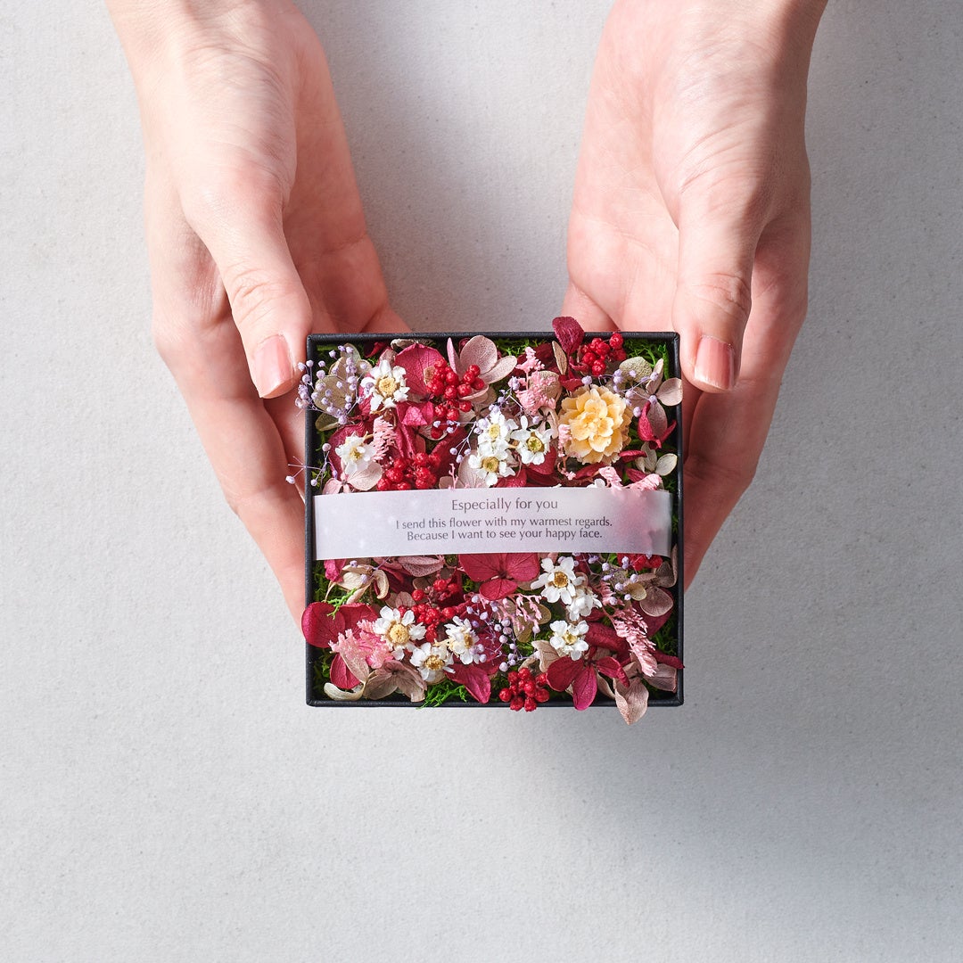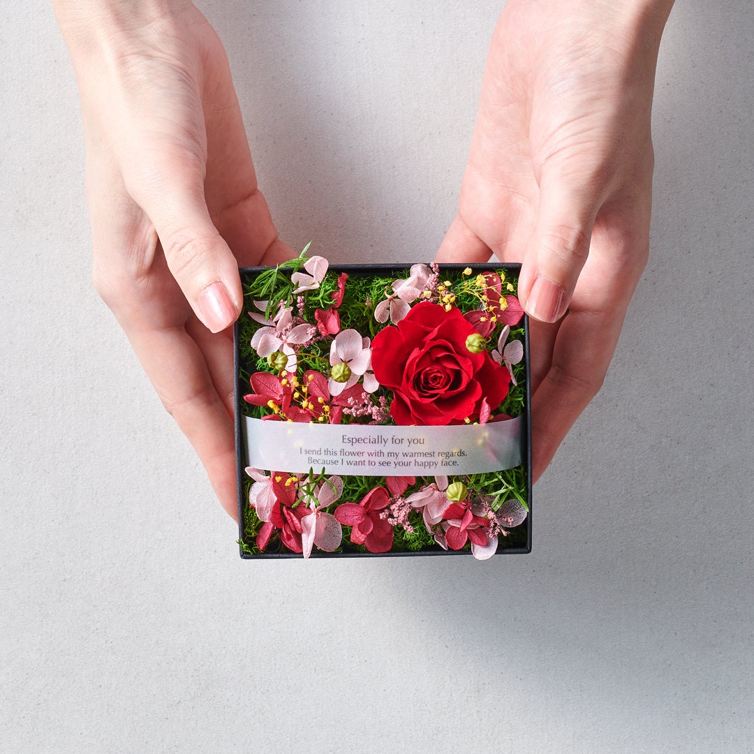 定番のバターサンド、〈あまおう苺〉、〈苺ショコラ〉の3種をそれぞれ組み合わせ、ピンクの可愛らしいスリーブに包みました。上品な仕上がりのプリザーブドフラワーボックスは、ピンクの可愛らしい花々を散りばめた「ミックスボックス」と、存在感のある真っ赤なバラを際立たせた「ローズボックス」の2種展開。お贈りする方のイメージに合ったフラワーボックスをお選びいただき、日ごろの感謝の気持ちを伝えるのはいかがでしょう。