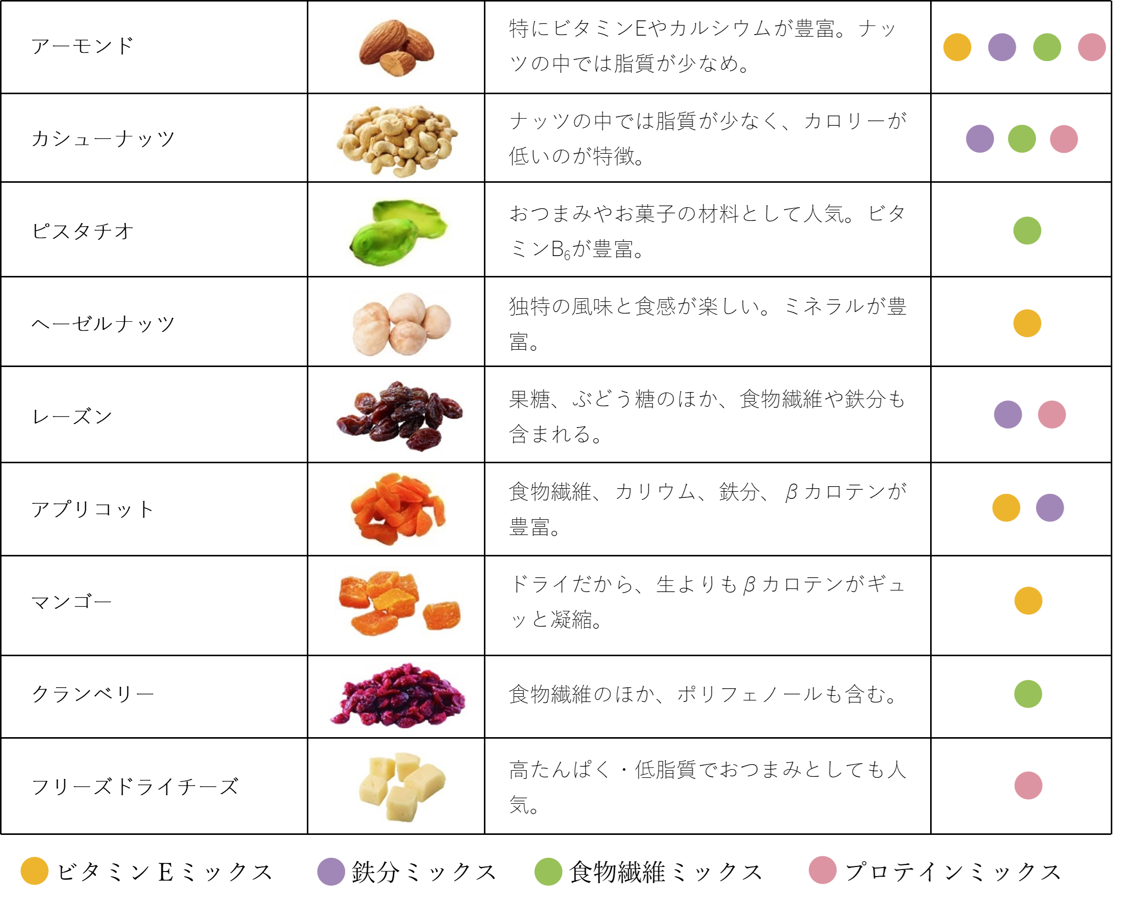 | 原材料名 | ●ヘルシーナッツ&フルーツ(ビタミンEミックス):アーモンド(アメリカ)、ヘーゼルナッツ、ドライマンゴー(マンゴー、砂糖)、ドライアプリコット(アプリコット、米粉)/漂白剤(二酸化硫黄)、酸化防止剤(亜硫酸塩) ●ヘルシーナッツ&フルーツ(鉄分ミックス):アーモンド(アメリカ)、オイルコートレーズン(レーズン、植物油)、カシューナッツ、ドライアプリコット(アプリコット、米粉)/漂白剤(二酸化硫黄) ●ヘルシーナッツ&フルーツ(食物繊維ミックス):アーモンド(アメリカ)、クランベリー砂糖漬(クランベリー、砂糖、植物油)(アメリカ製造)、ピスタチオ、カシュ―ナッツ ●ヘルシーナッツ&フルーツ(プロテインミックス):レーズン(アメリカ製造)、アーモンド、カシュ―ナッツ、フリーズドライチーズ(乳成分を含む) |