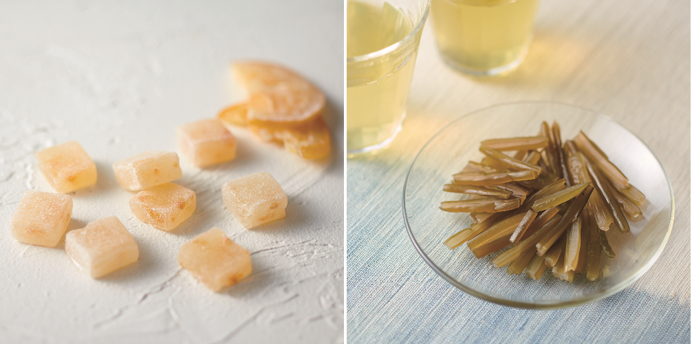 無印良品では素材や製法にこだわり、毎日のおやつとして楽しんでいただけるお菓子を作っています。今回は国産の清見オレンジとはっさくを使い、フルーツ本来の風味が飛ばないように、低温でじっくりとシロップを浸み込ませてドライフルーツを作りました。さらに、そのドライフルーツを作る工程で発生する使われない素材を活用して寒天もちも作りました。果皮の切れ端をミンチ状にしてもち粉と寒天を入れた生地に練り込み、ドライフルーツを作る際に使用したシロップも使うことで、フルーツの自然な風味を加えた寒天もちを作りました。