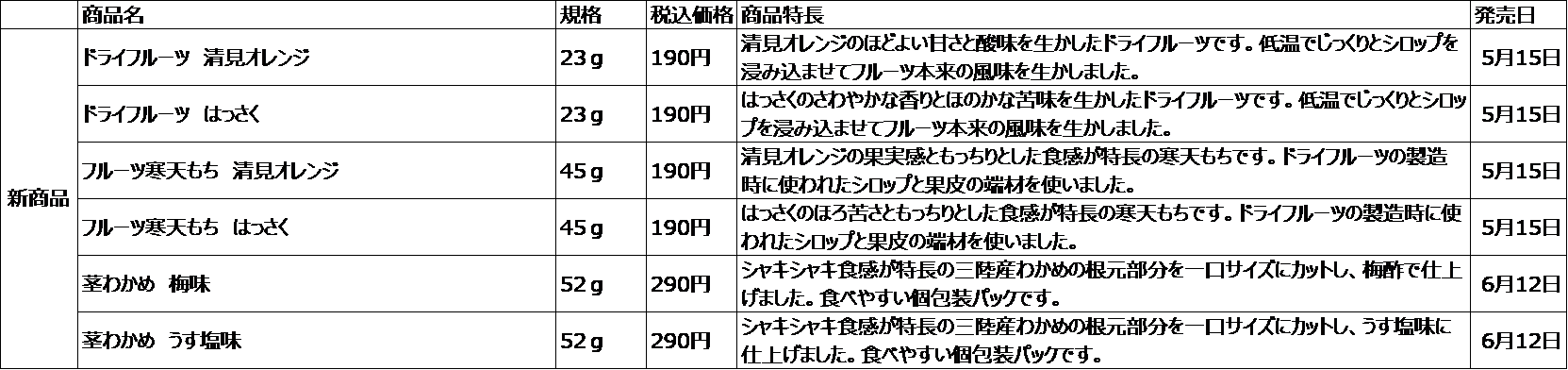 良品計画は、「感じ良い暮らしと社会」の実現にむけて日常生活の基本を支えることを目指し、日々の暮らしを豊かにする商品・サービスを提供しています。1980年の誕生以来、3つの視点「素材の選択」、「工程の点検」、「包装の簡略化」を守りながら商品をつくり続けています。4月にはみかんの缶詰や、アップルパイなどに使用するりんごの蜜漬けを作る際にはじかれる果物の端材を活用して、ゼリーを発売しました。今回はドライフルーツを製造する際に発生する果皮の切れ端やシロップを活用して作った寒天もちと、捨てられていたわかめの元茎を活用して作った茎わかめを発売します。