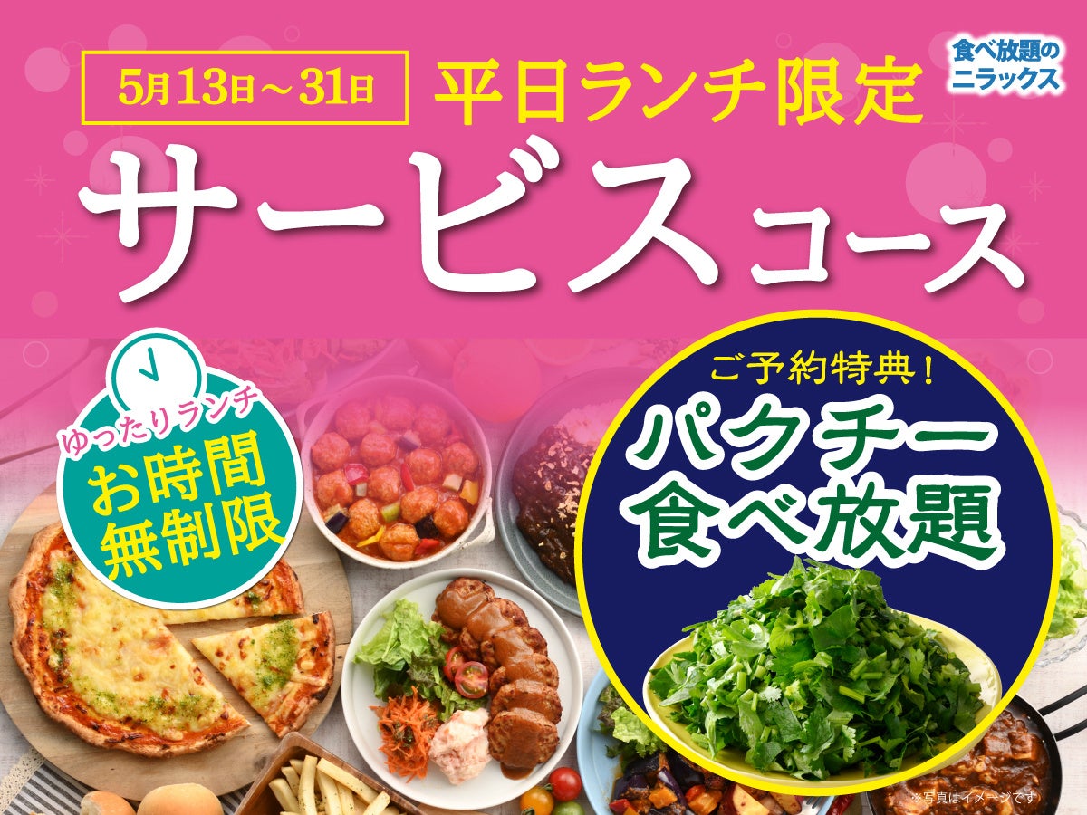 バラエティー豊かな食べ放題が楽しめる『ニラックスブッフェ』24店舗で人気の平日ランチ限定の『サービスコース』。