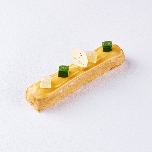 細長く焼いたシュー皮に、マンゴークリームをたっぷり詰め込みました。トッピングの抹茶の生チョコとユズのパートドフリュイと一緒に食べると一口ごとに異なる味わいが楽しめます。