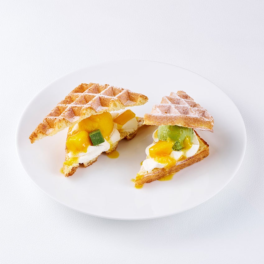 こだわりのワッフルの上に、香り豊かな愛知県西尾抹茶とホワイトチョコレートのアイスとマンゴーユズソルベ載せた逸品。フレッシュな北海道根釧産生クリームにはマンゴーソースをたっぷりかけました。