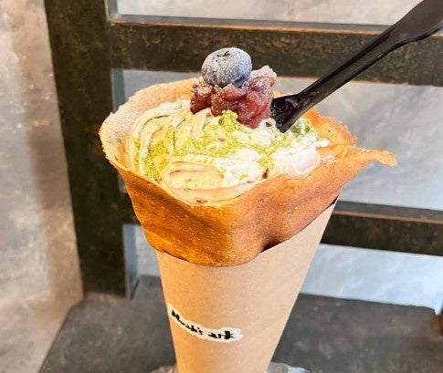 “日常に少しのやすらぎを”をコンセプトに、ゆったりとした空間で、ホテルでパティシエの修業を積んだ店主が腕を振るうカフェ。オリジナルの生地に煎茶を練り込み、軽めの小豆生クリームを包んで煎茶をふりかけたクレープは、本イベント限定です。香り高い煎茶と、甘いクレープのマリアージュをお楽しみいただけます。