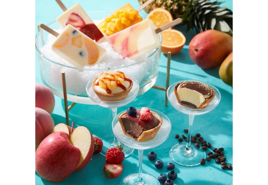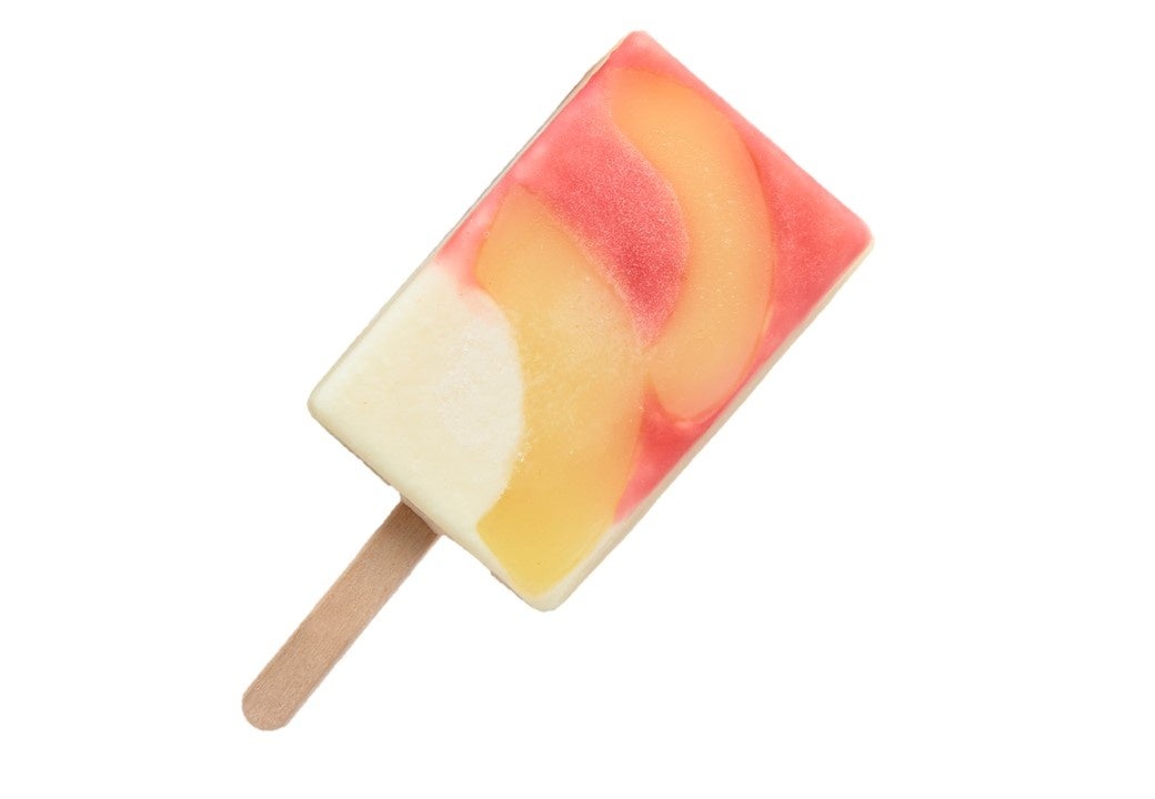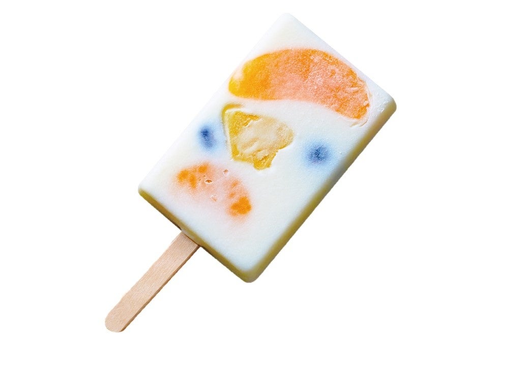 ミルクアイスクリームベースに黄桃やオレンジ、パイナップル、ブルーベリーを閉じ込めた、贅沢なアイスバー。