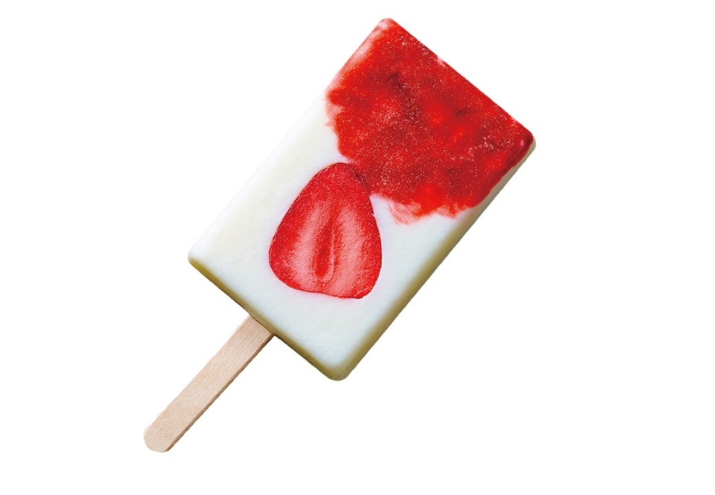 ミルクアイスベースにいちごのホールスライスやダイスカットをあしらった、目にも鮮やかでかわいいアイスバー。