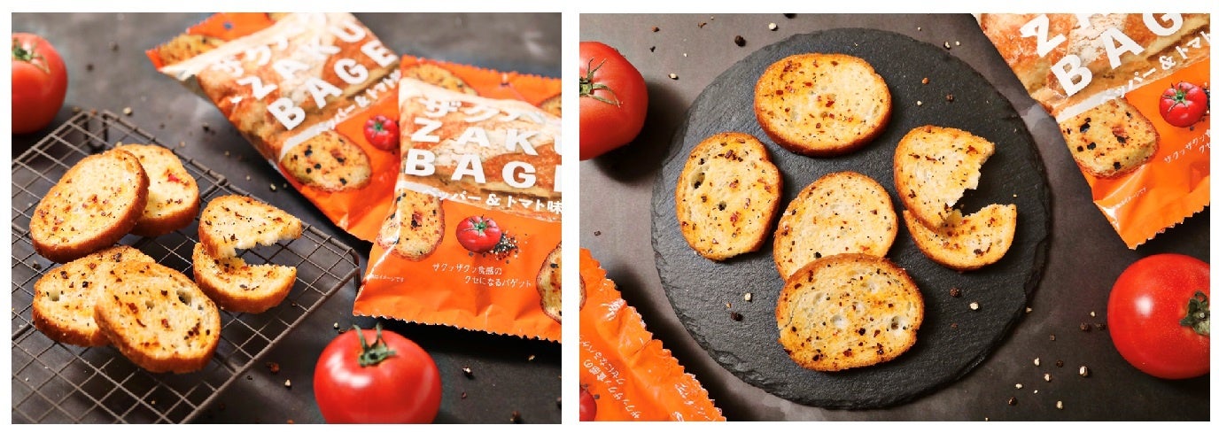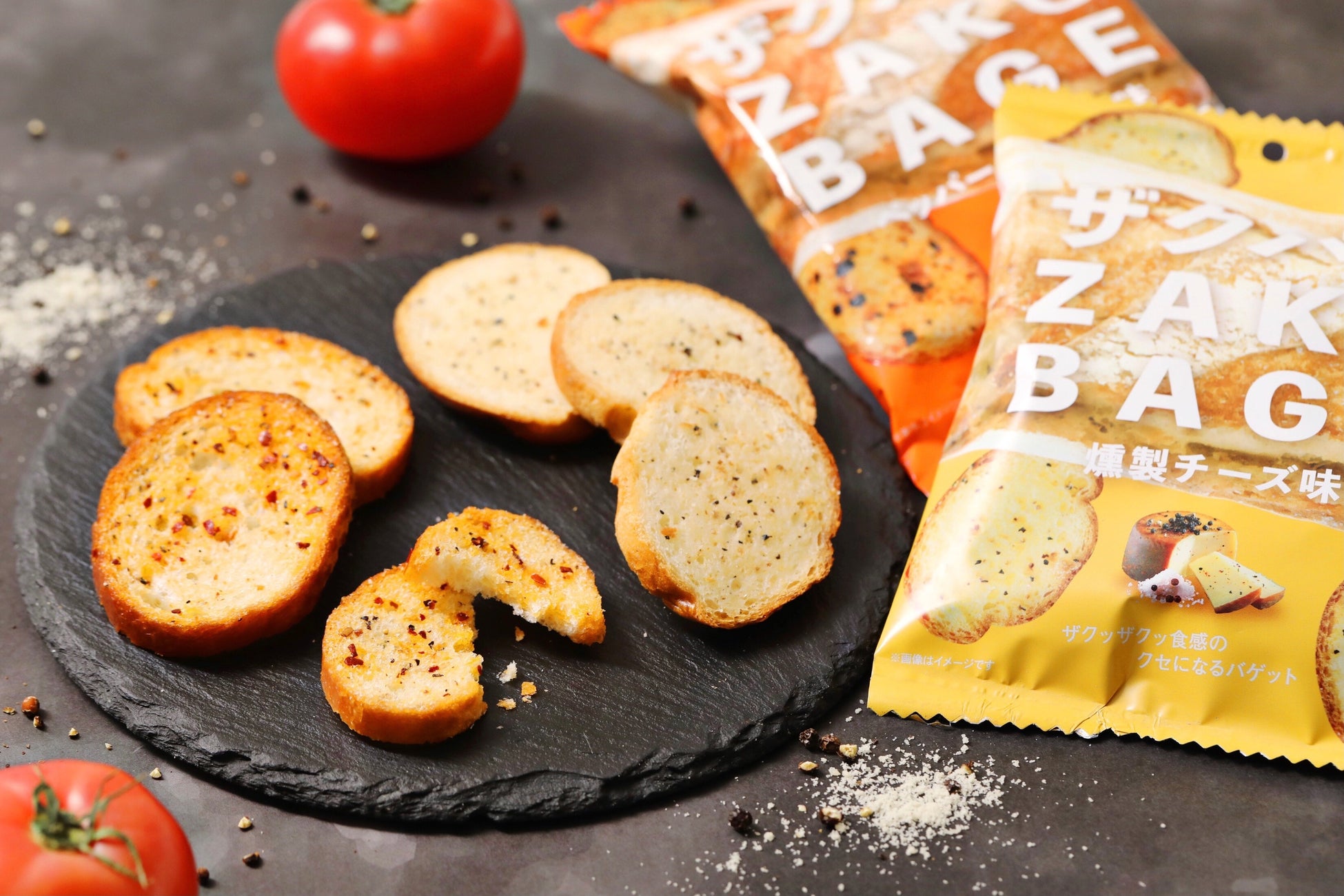 そしてこのたび、ベーカリーの定番商品である バゲットを日常のおやつやお酒のおつまみとしても気軽にお楽しみいただきたいという想いから、”ザクッザクッ食感がクセになる“バゲットを開発、新商品『ザクバゲ 燻製チーズ味』『ザクバゲ ペッパー&トマト味』を発売いたします。
