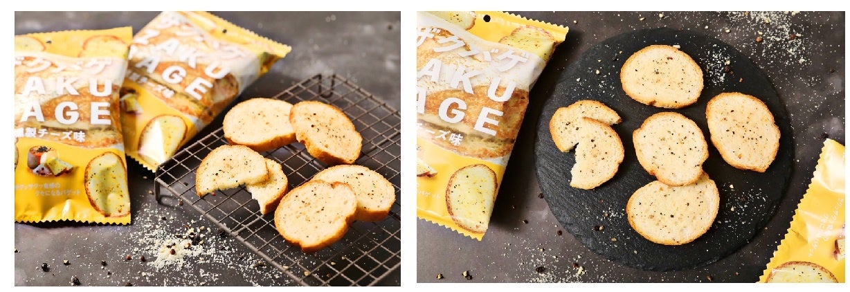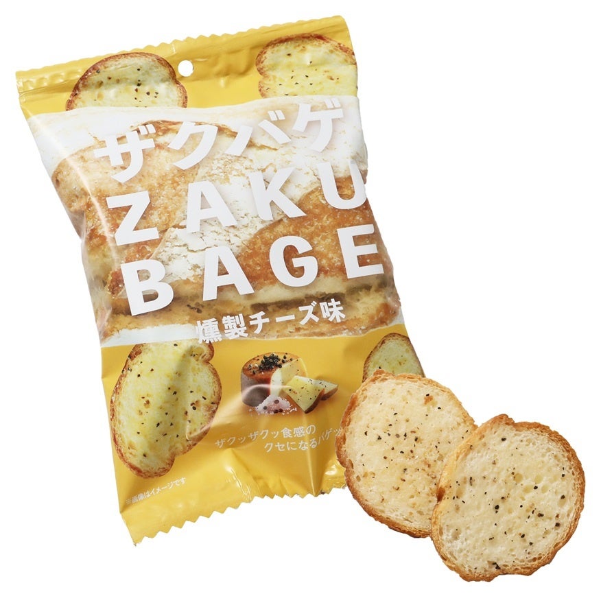 『ザクバゲ 燻製チーズ味』は、薄くスライスした小麦の香り豊かなバゲットにパルメザンチーズをちりばめ、ブナのチップで燻製したあらびきブラックペッパーと岩塩を効かせて焼き上げました。パルメザンチーズと燻製の香り、ピリッとしたあらびきブラックペッパーがアクセントのクセになる味わいです。