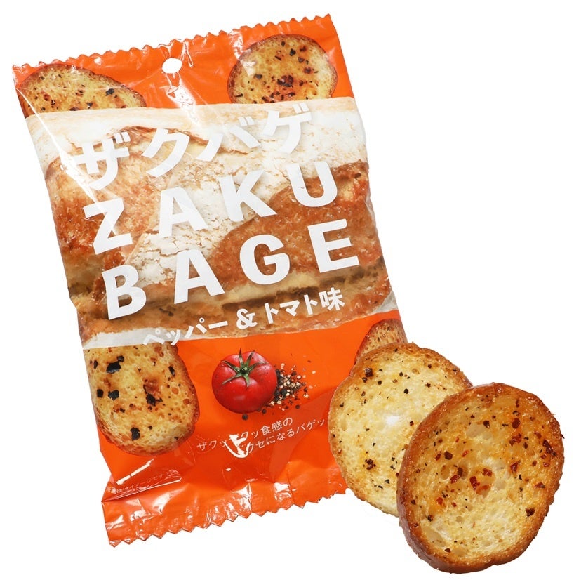 『ザクバゲ ペッパー&トマト味』は、スライスバゲットにドライトマト、ペッパーを含む13種類のスパイスを合わせて焼き上げました。トマトの旨み、ピリッとしたペッパーの辛味などスパイスが織りなす味わいがやみつきになるバゲットです。