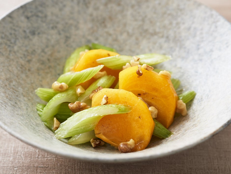 柿の上品な甘み、セロリの香り、くるみの香ばしさが不思議と合う、クセになる味。