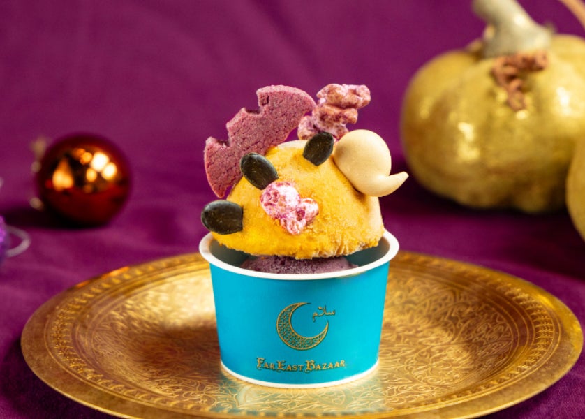 北海道産くりりんかぼちゃのジェラートに、紫芋のコウモリやメレンゲのおばけが集まって、愉快な収穫祭のはじまり!