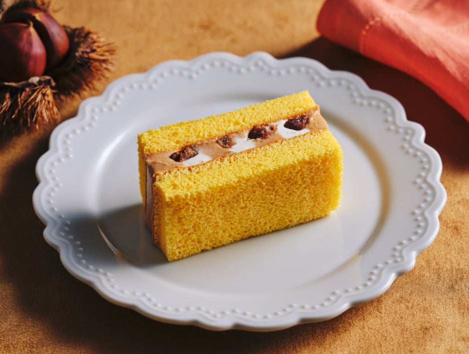 卵たっぷりのふわふわシフォン生地に、生クリームとモンブランクリームを絞り、刻み栗と一緒にサンド。