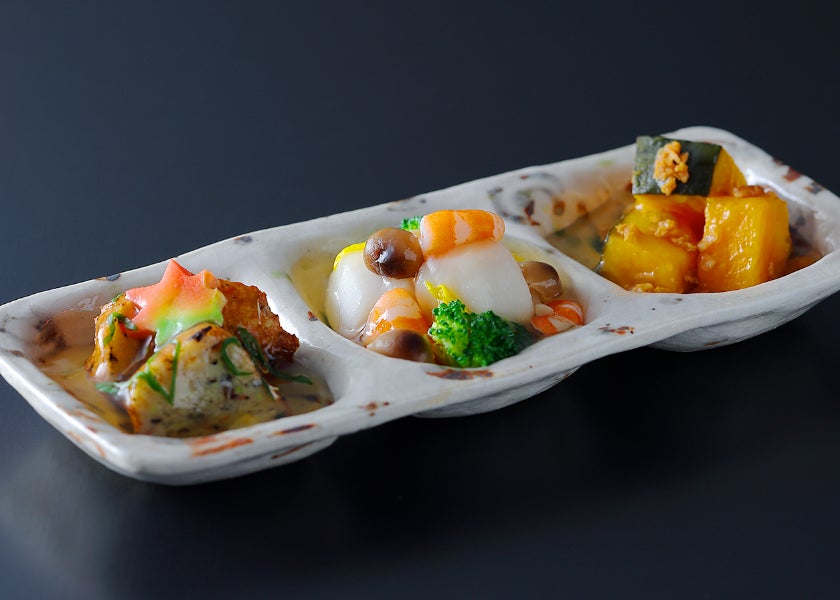 南瓜+鶏そぼろ、紅葉麩+飛龍頭、里芋+海老の秋らしい3種に、上品なだしの風味のあんがとろ~り。