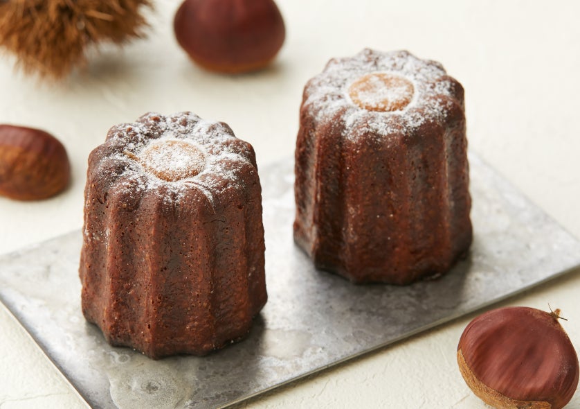 マロンペーストを使ったカヌレをマロン風味のグレーズと粉糖で仕上げた、栗づくしの幸せ。