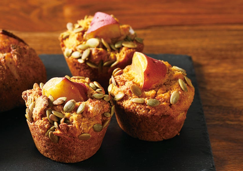 かぼちゃピューレ&角切りさつまいも入りマフィンの上に、鳴門金時がゴロンと。