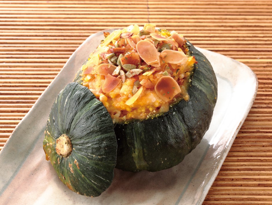 かぼちゃ、アーモンド、玉ねぎなどを詰めた濃厚グラタン。皮の器ごと味わえます。