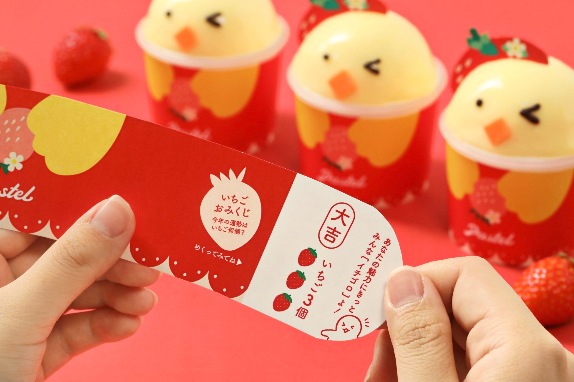 こだわり:シリーズ累計販売個数25万個※1突破の大人気スイーツ『タマコプリン』が、旬の苺を楽しめる苺フレーバーになって新登場。キュートな苺の帽子を被っておめかしした姿に変身!「なめらかあまおう苺プリン」の上に、スポンジ、ホイップクリーム、ふんわり⾷感のバニラムースを重ねました。苺のスリーブは、お正月にもぴったりな「おみくじ」付き。今年の