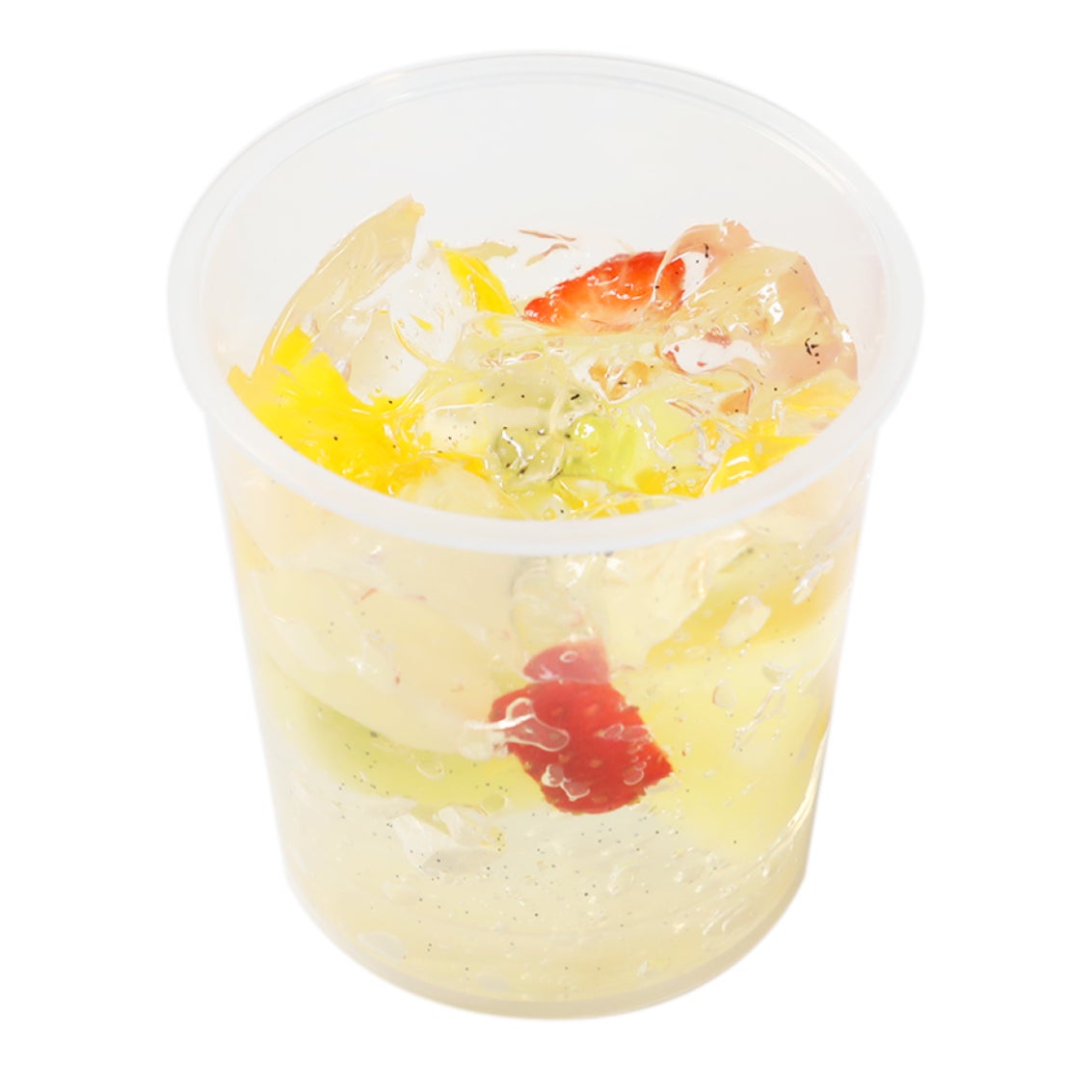 こだわり:爽やかなライムがほのかに香るなめらかな⾷感のゼリーに、5種類のフルーツ(イチゴ・⻩桃・キウイ・パイン・洋なし)を合わせたスイーツです。