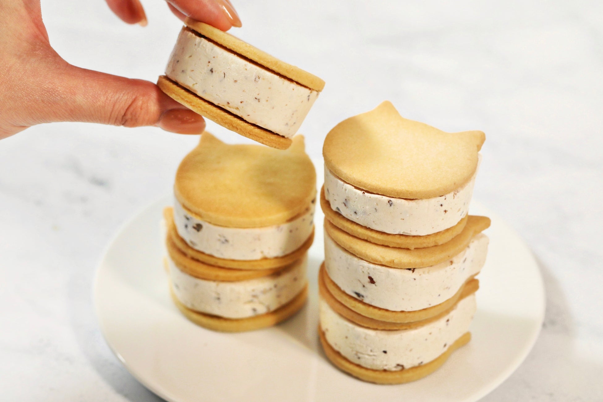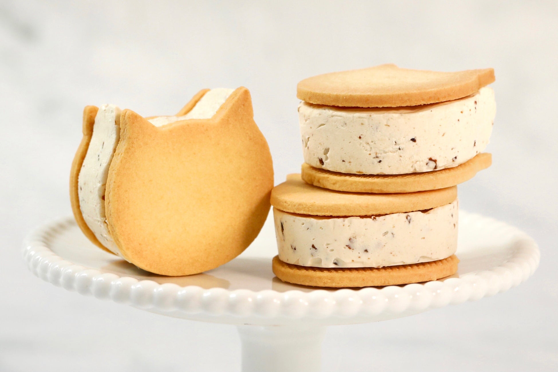 こだわり:「ねこねこ」史上初のバターサンドが新登場!サクサク食感のサブレクッキーで、レーズンの風味豊かなバタークリームをサンドしました。ほんのり効いたラムの風味がバタークリームのコクを引き立てます。デザインは、「ねこねこチーズケーキ」の公式SNSで募集し当選したお客様のねこちゃんを、猫専門イラストレーター Coony(クーニー)さんが描いた限定イラストをはじめ、~ねこねこの日~をテーマにした計4種類のパッケージでご用意いたしました。ぜひ全種類コンプリートしてみてくださいね。