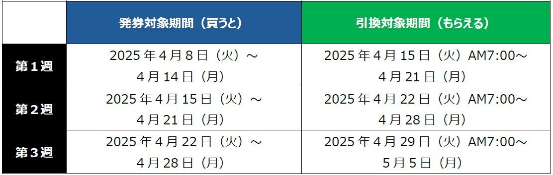 | 発券対象期間(買うと) | 引換対象期間(もらえる) |