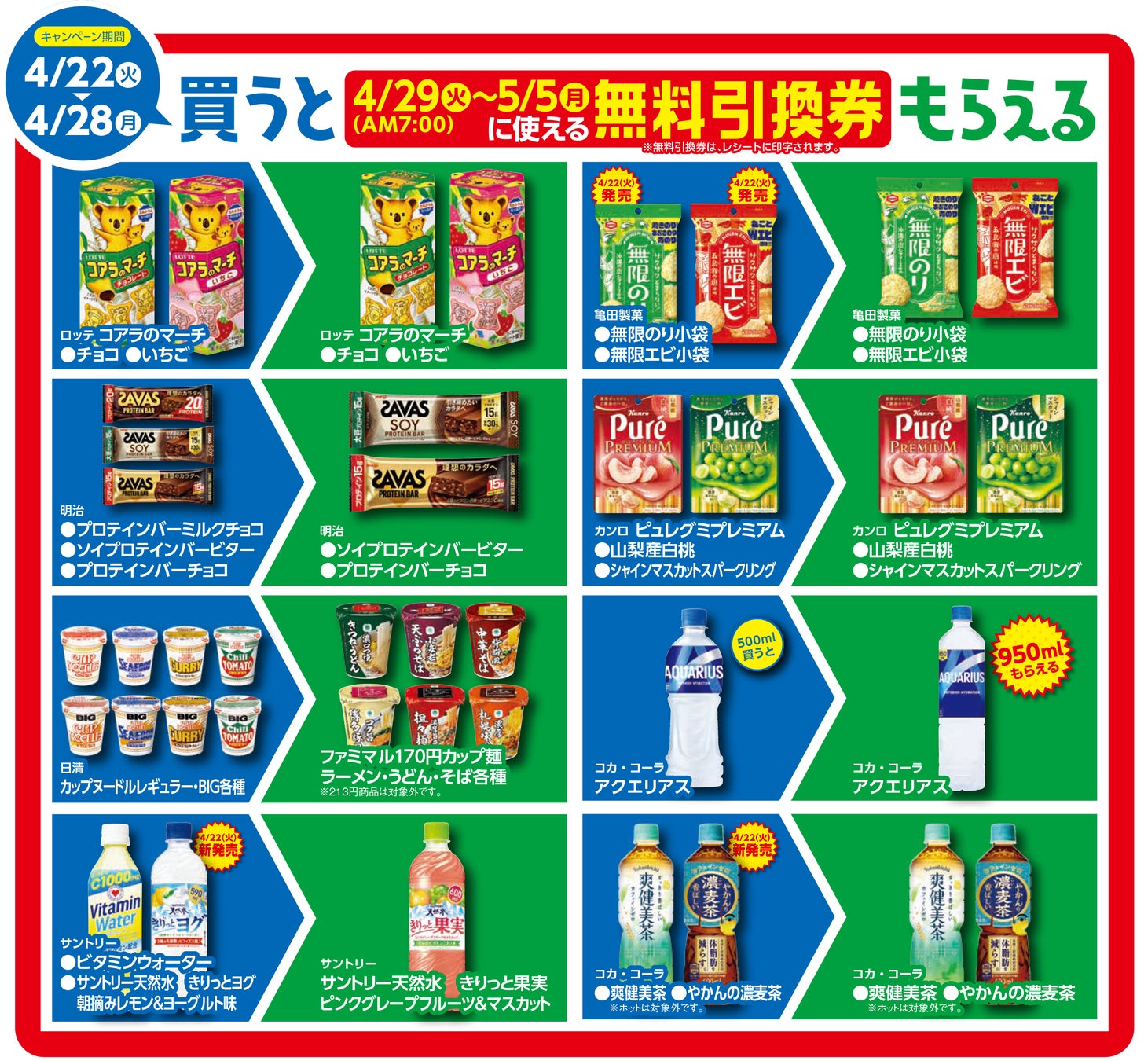 小腹満たしのおやつ系は勿論、飲み物、カップ麺など幅広い商品が対象商品なのが嬉しいです。新生活はファミマでお得に楽しみましょう!